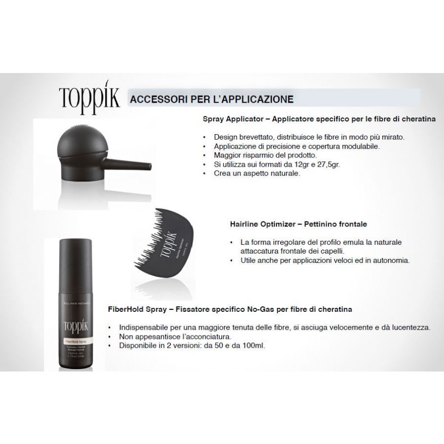Modo d'uso: Dopo aver applicato Toppik Hair Fibers modellare l’acconciatura fino ad ottenere il risultato desiderato poi spruzzare uniformemente.