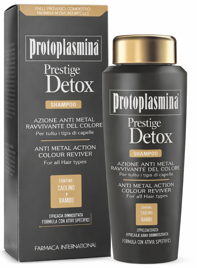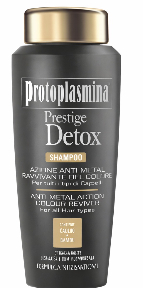 Protoplasmina Prestige Detox, formulato con Sodio Gluconato, chelante naturale dall'azione detossinante, deterge delicatamente i capelli rimuovendo le particelle metalliche e nutrendo in profondità la fibra capillare.
