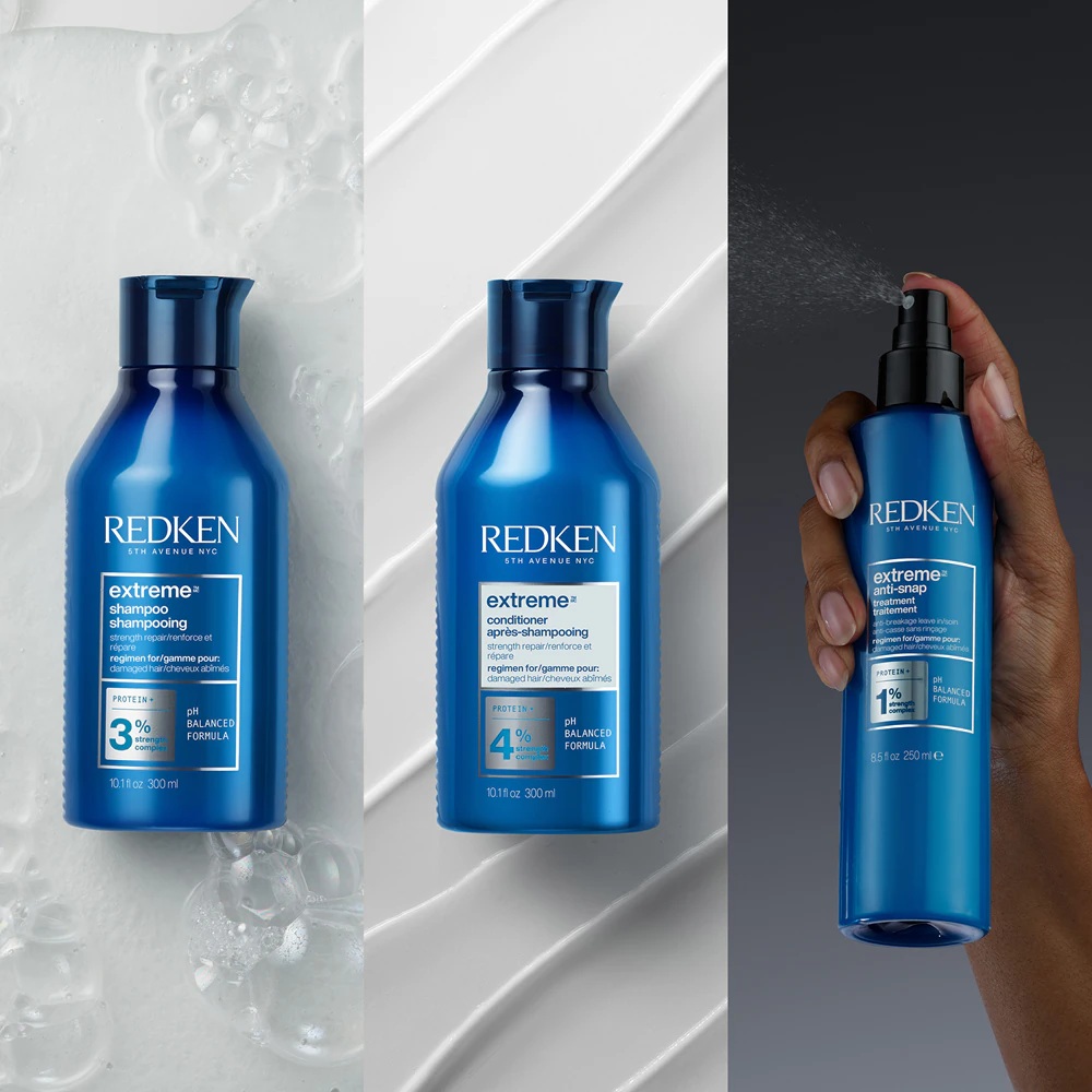 Kit Redken Extreme shampoo, conditioner e trattamento, ideale per capelli sfibrati e danneggiati, che necessitano una ristrutturazione profonda.